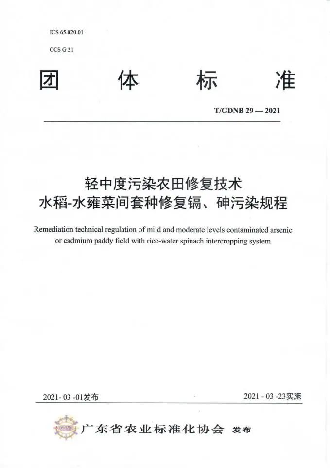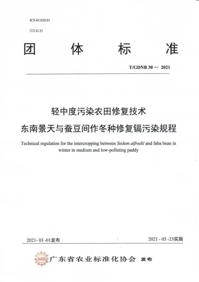 【CONGRATULATION】 喜 報 熱烈祝賀 我司參與制定的標準 頒布實施 我司與華南農(nóng)業(yè)大學資源環(huán)境學院、中國科學院地理科學與資源研究所等單位合作開展高低累積水稻品種間作修復鎘污染,水稻-水雍菜間套種修復鎘、砷污染,東南景天與蠶豆間作冬種修復鎘污染等研究工作,聯(lián)合起草了《輕中度污染農(nóng)田修復技術 高低累積水稻品種間作修復鎘污染規(guī)程》(T/GDNB28-2021)、《輕中度污染農(nóng)田修復技術 水稻-水雍菜間套種修復鎘、砷污染規(guī)程》(T/GDNB29-2021)、《輕中度污染農(nóng)田修復技術 東南景天與蠶豆間作冬種修復鎘污染規(guī)程》(T/GDNB30-2021),通過廣東省農(nóng)業(yè)標準化協(xié)會組織的標準審定并發(fā)布實施(2021年3月23日實施)。 廣東韶科環(huán)??萍加邢薰?nbsp; 20121年4月9日