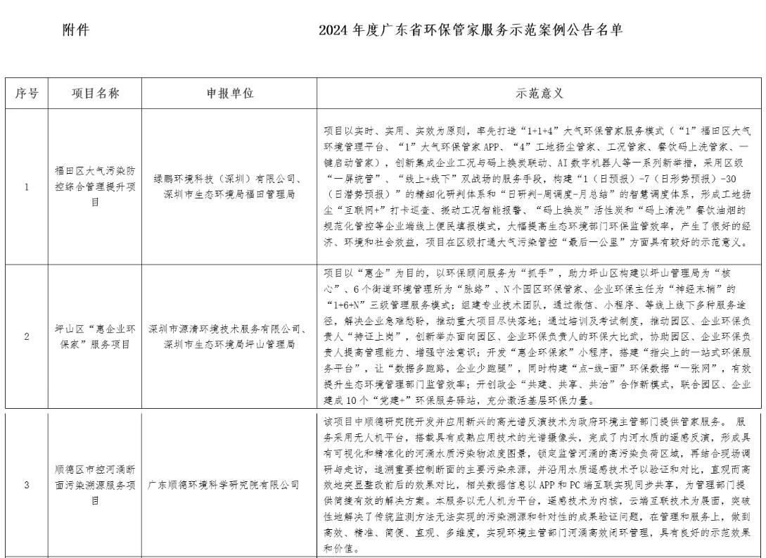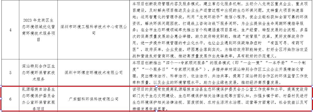 近日,廣東省環(huán)境保護(hù)產(chǎn)業(yè)協(xié)會公布了“2024年度廣東省環(huán)保管家服務(wù)示范案例”名單,我司承接的“乳源瑤族自治縣生態(tài)環(huán)境保護(hù)委員會辦公室環(huán)保管家服務(wù)項目”成功入選。